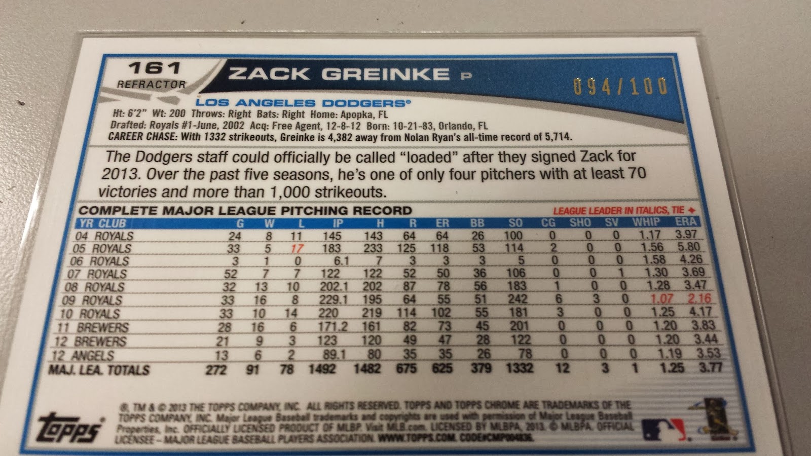 Usually that is end of story but the buyer emailed me after the auction and said since I was his first sale ever he wanted to give me a bonus and he asked if I collected Dodgers only. Said yes, and he said he would throw in Zack Greinke's black refractor of the then just released Topps Chrome set. Now that is a nice bonus as somewhere down the road I was going to hunt it down and now I didn't have to and probably saved at least 4-5 dollars. With the all the cards with a combined over $30 book value I know I received a great deal here.